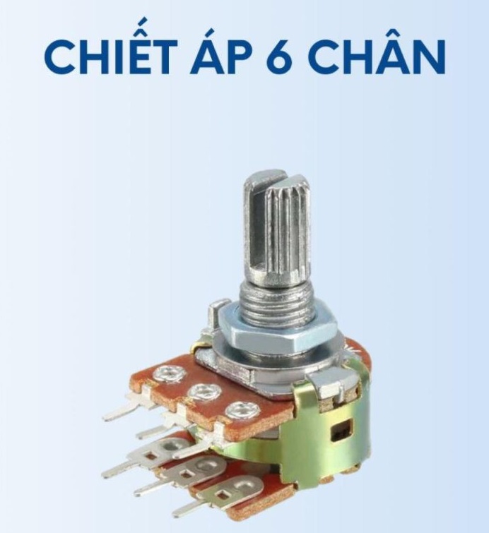 Chiết áp 6 chân không phổ biến bằng chiết áp 3 chân, nhưng vẫn là một thiết bị quen thuộc trong cuộc sống hàng ngày, đặc biệt trong các thiết bị âm thanh. Chiết áp 6 chân có 6 tiếp điểm để nhận và truyền tín hiệu, và có thể được chia thành hai loại: chiết áp 6 chân đôi (chiết áp 6 chân 2 tầng) và chiết áp 6 chân 1 tầng.