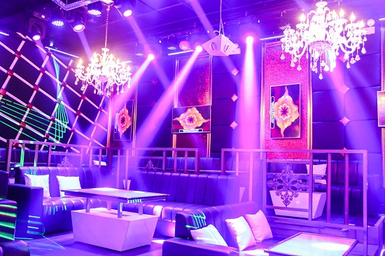 Hiệu ứng của thiết bị ánh sáng làm nổi bật mặt tiền của quán, thu hút khách nhờ ánh sáng sân khấu và đèn led tạo ra không khí của một câu lạc bộ đêm với điểm nhấn của ánh sáng chuyên nghiệp.Hệ thống ánh sáng được sử dụng trong thiết kế vũ trường quán bar.