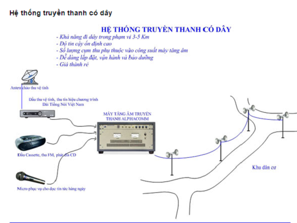 - Hệ thống truyền thanh có dây bằng đồng và amply- tăng âm truyền thanh đã tồn tại và phát ở Việt Nam hơn 30 năm qua, công nghệ thiết bị được sử dụng kết nối bằng dây dẫn nên việc truyền tải thông tin rất tốt. Một hệ thống truyền thanh phường xã đầy đủ bao gồm: