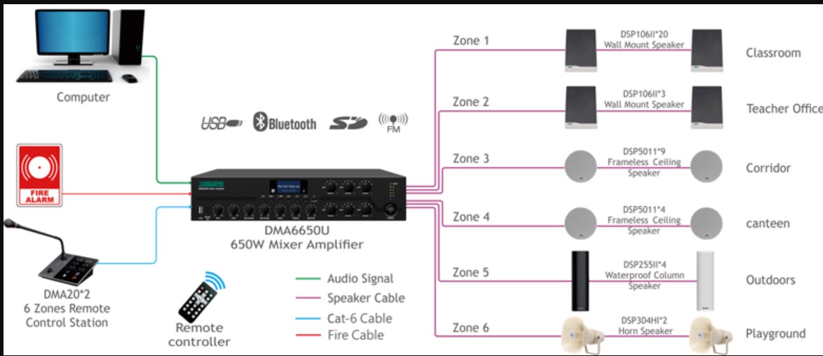 -  Phân vùng âm thanh thông minh: Thiết kế âm thanh riêng biệt cho từng khu vực: lớp học, sân chơi, hành lang, cổng trường, nhà ăn...
