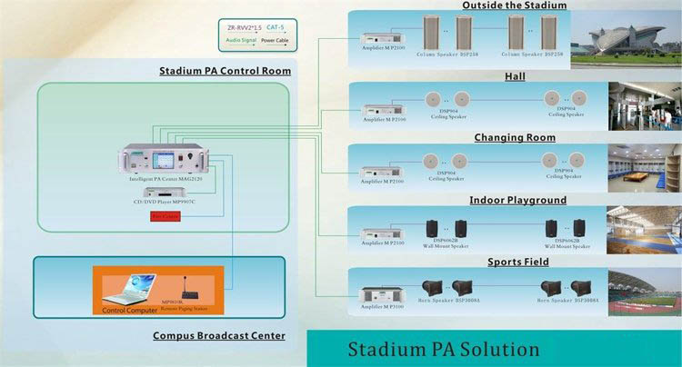 Giải pháp này có thể áp dụng được ở các sân vận động để đáp ứng nhu cầu phát sóng. Giải pháp có các chức năng như phát sóng khẩn cấp, thông báo và phát sóng nền. Máy chủ điều khiển chính được đặt ở phòng điều khiển sân vận động và loa được đặt ở những nơi chỉ định như xung quanh sân vận động, hội trường, phòng thay đồ,...