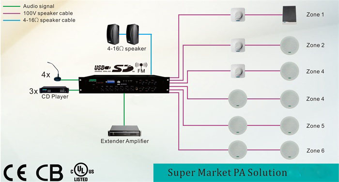 Đây là giải pháp 6 kênh được cung cấp bởi AAG. Giải pháp có thể đáp ứng nhu cầu phát sóng công cộng ở các siêu thị. Giải pháp có các chức năng như phát sóng khẩn cấp, thông báo kinh doanh, phát sóng nền. Giao diện điều khiển có nhiều nguồn đầu vào âm thanh: 4 đầu vào MIC, 3 đầu vào AUX, bộ dò tích hợp, USB, SD tích hợp. Hỗ trợ quản lý 6 kênh, mỗi kênh có thể điều chỉnh âm lượng riêng biệt. Công suất đầu ra 100W nên âm thanh được phát ra rộng, với các loa được đặt ở các nơi chỉ định như nhà kho, khu mua sắm, bên ngoài siêu thị... Đây là giải pháp kinh tế tốt nhất cho những nơi nhỏ như siêu thị, khách sạn, trung tâm đào tạo...