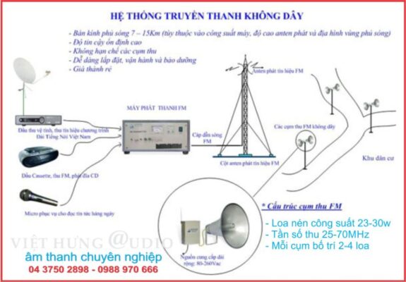 - Hệ thống truyền thanh không dây sóng FM theo đúng quy định của nhà nước, truyền tải xa đến 50-60km không cần dùng dây truyền thanh, rất tiện lợi cho vùng núi, hải đảo, nơi địa hình khó khăn phức tạp, khó thi công.
